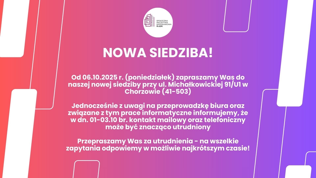 W związku z nadchodzącym zakończeniem prac budowlanych w ramach naszej inwestycji w Chorzowie przy ul. Michałkowickiej - niniejszym informujemy, że od 6 października 2025 r. będziemy do Waszej dyspozycji w naszym nowym biurze. Od tego dnia adres naszej siedziby to;
